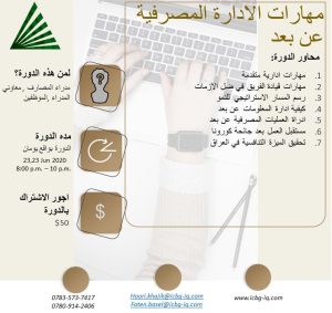 لذا يسرنا ان نقدم الى حضراتكم ورشه بعنوان(مهارات الادارة المصرفيه عن بعد) ولمدة يومان وبواقع 2ساعه يومين